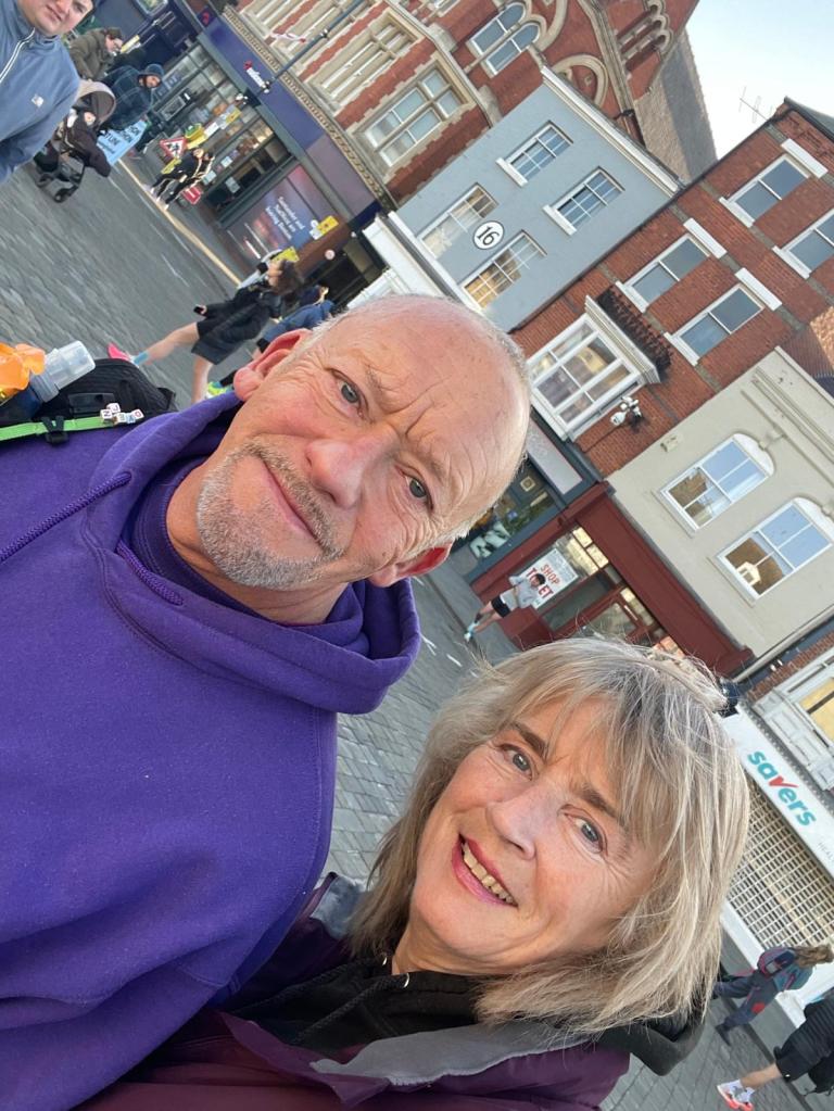 Sunday morning I found myself in the Market Place (the market had gone) 90s House Music blared out from some speakers, a man on a michrophone was sayin stuff (I think they were words of encouragement) Was I the only one shivering under three layers? It was windy! Gillian had her route map for photos, I found some friends, had a photo with one, wished each other good luck and waited until 8am for the start.