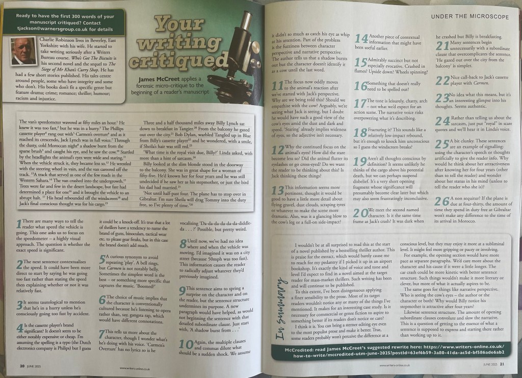 When I told my editor I was going to have the first 300 words of my forthcoming novel critiqued in Writers Magazine she said. “You’re brave!” James McCreet does a wonderful job of stripping your writing down to the bare bones. So I offered it up with some trepidation.